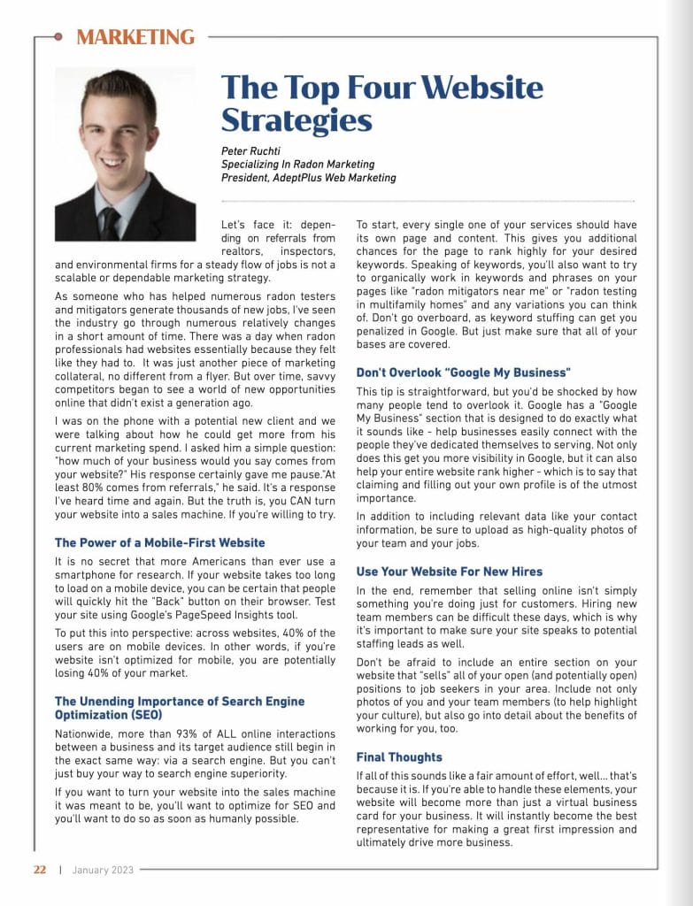 We are delighted to announce that we've been featured in the highly exclusive "The Radon Reporter," a reputable magazine produced and published by the American Association of Radon Scientists and Technologists (AARST).